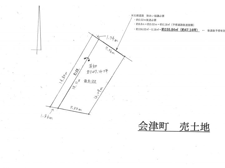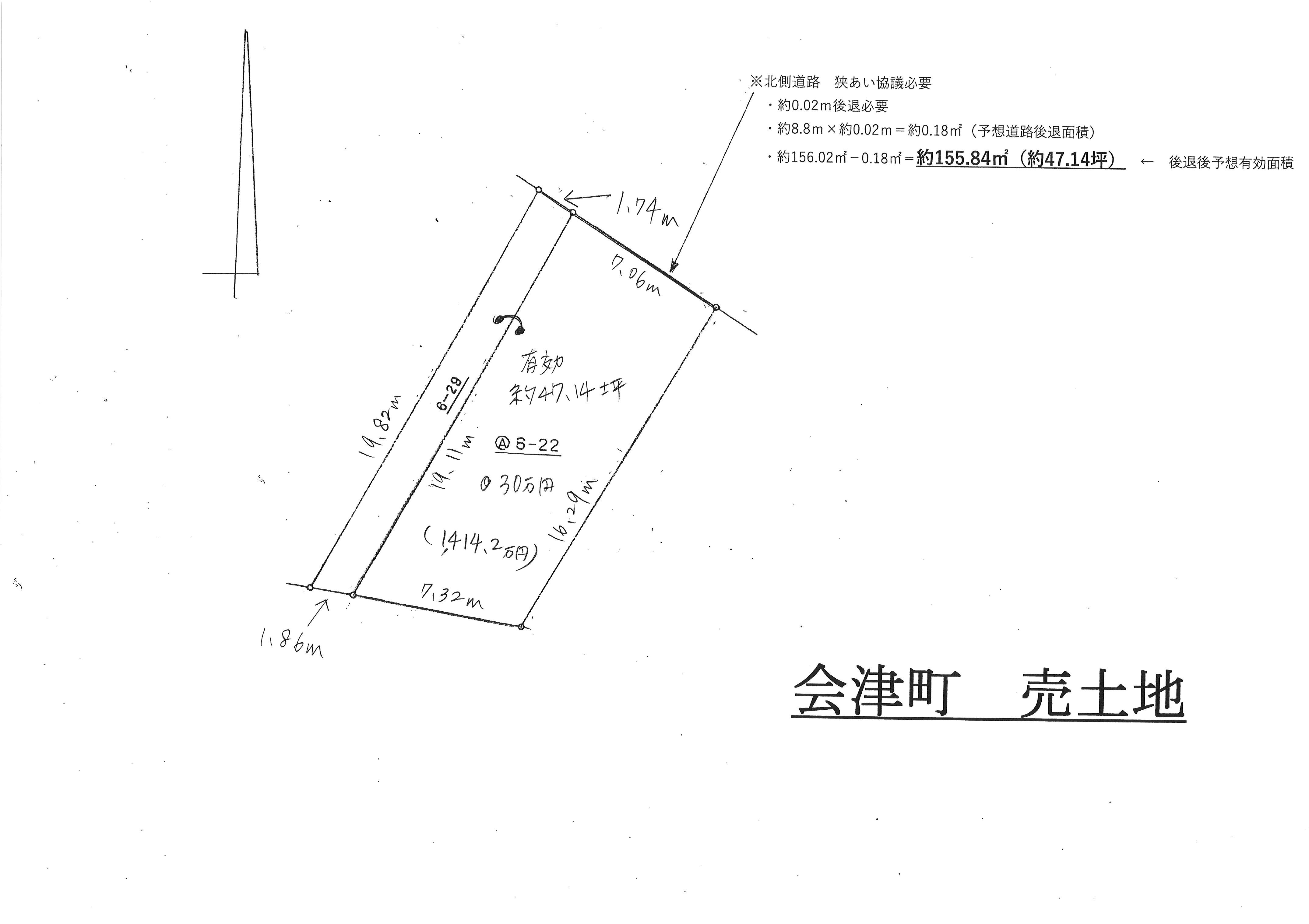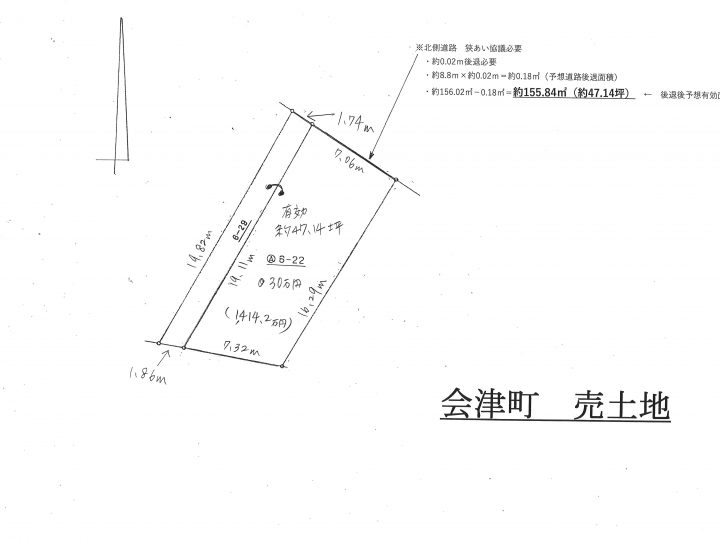 地目宅地現況宅地面積有効155.84㎡(47.14坪)道路北側 公道 約3.98m接道幅約8.8m